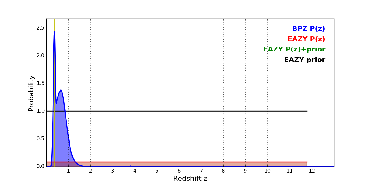 In P(z) plots: Yellow lines mark the cluster redshift z = 0.390,