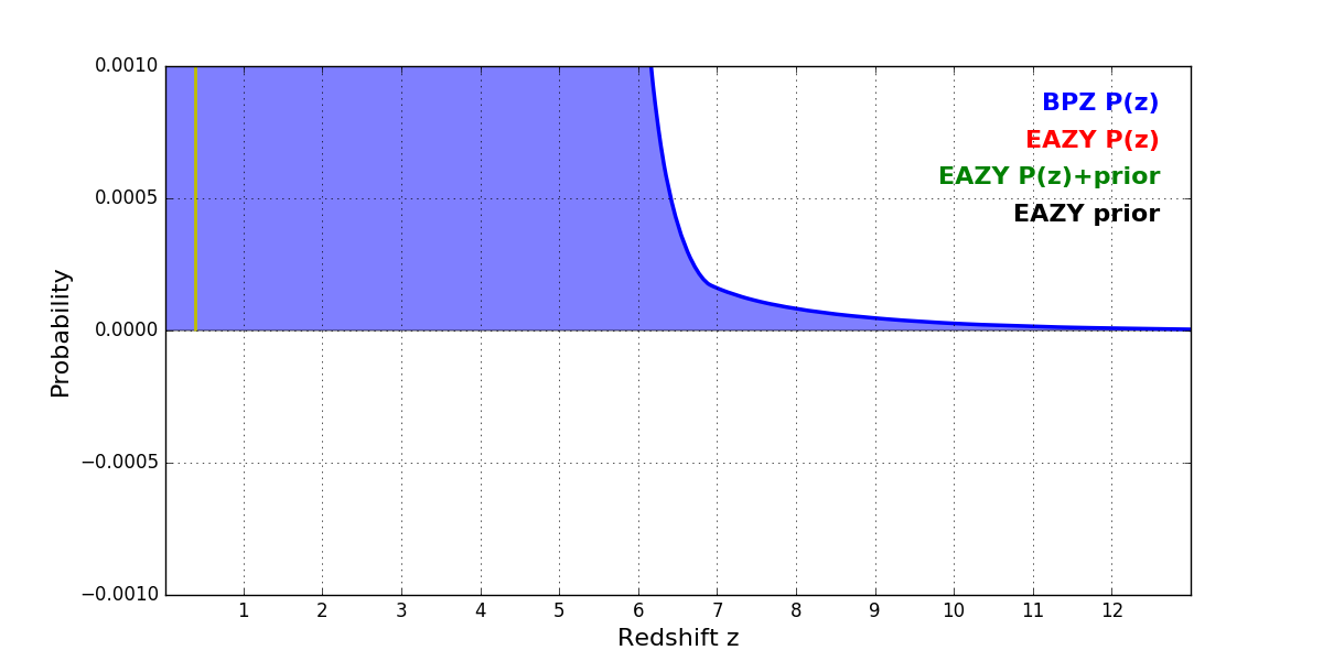 In P(z) plots: Yellow lines mark the cluster redshift z = 0.390,