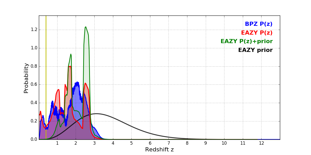 In P(z) plots: Yellow lines mark the cluster redshift z = 0.390,