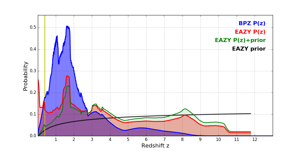 In P(z) plots: Yellow lines mark the cluster redshift z = 0.390,