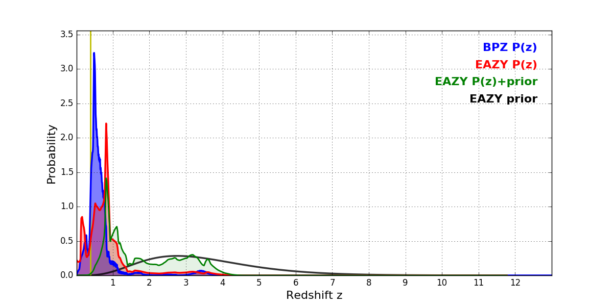 In P(z) plots: Yellow lines mark the cluster redshift z = 0.390,