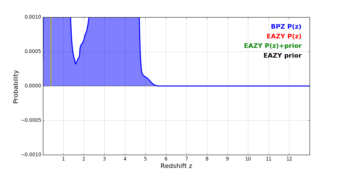 In P(z) plots: Yellow lines mark the cluster redshift z = 0.390,