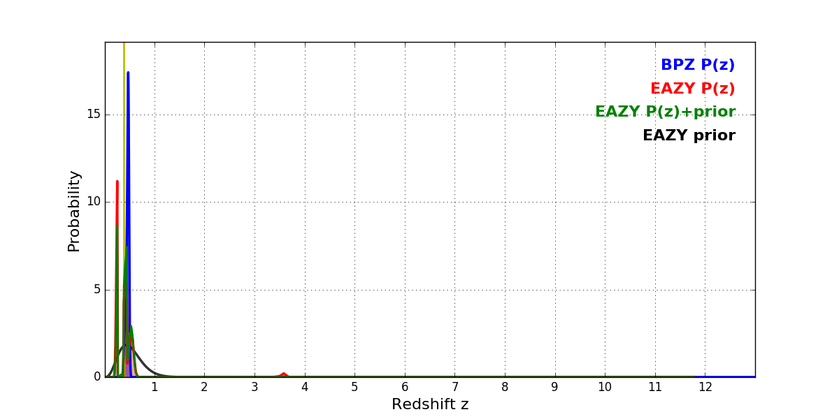 In P(z) plots: Yellow lines mark the cluster redshift z = 0.390,