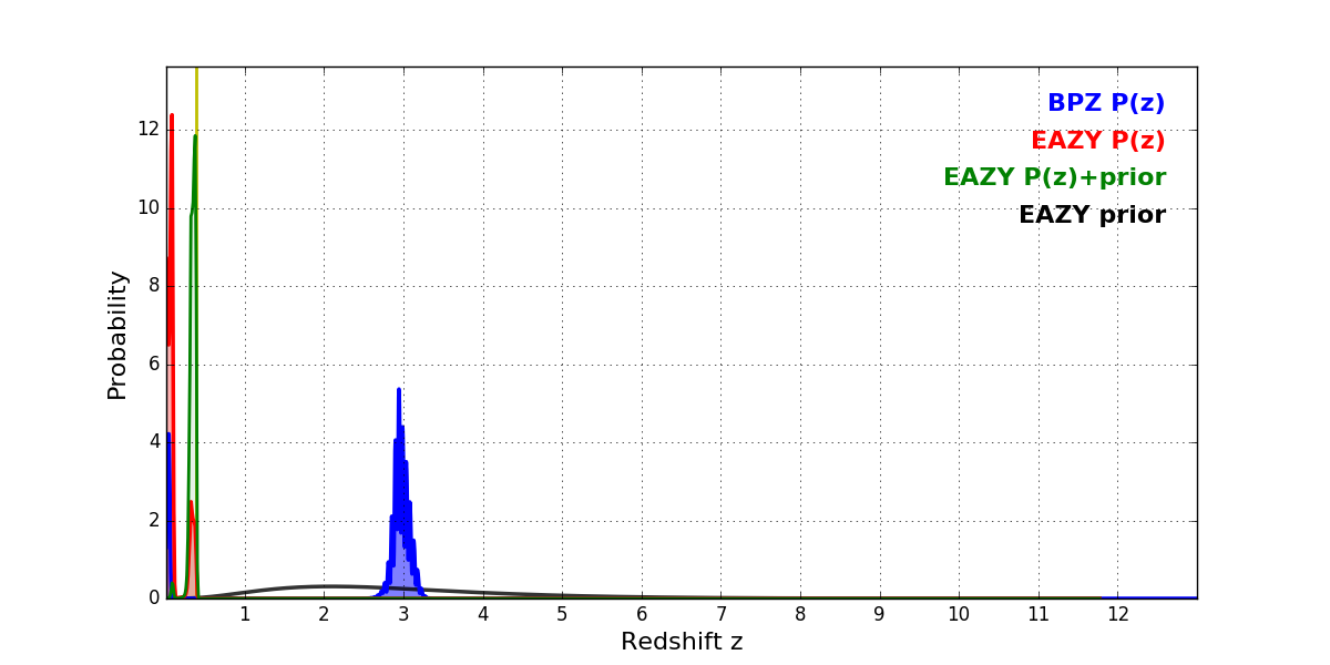 In P(z) plots: Yellow lines mark the cluster redshift z = 0.390,