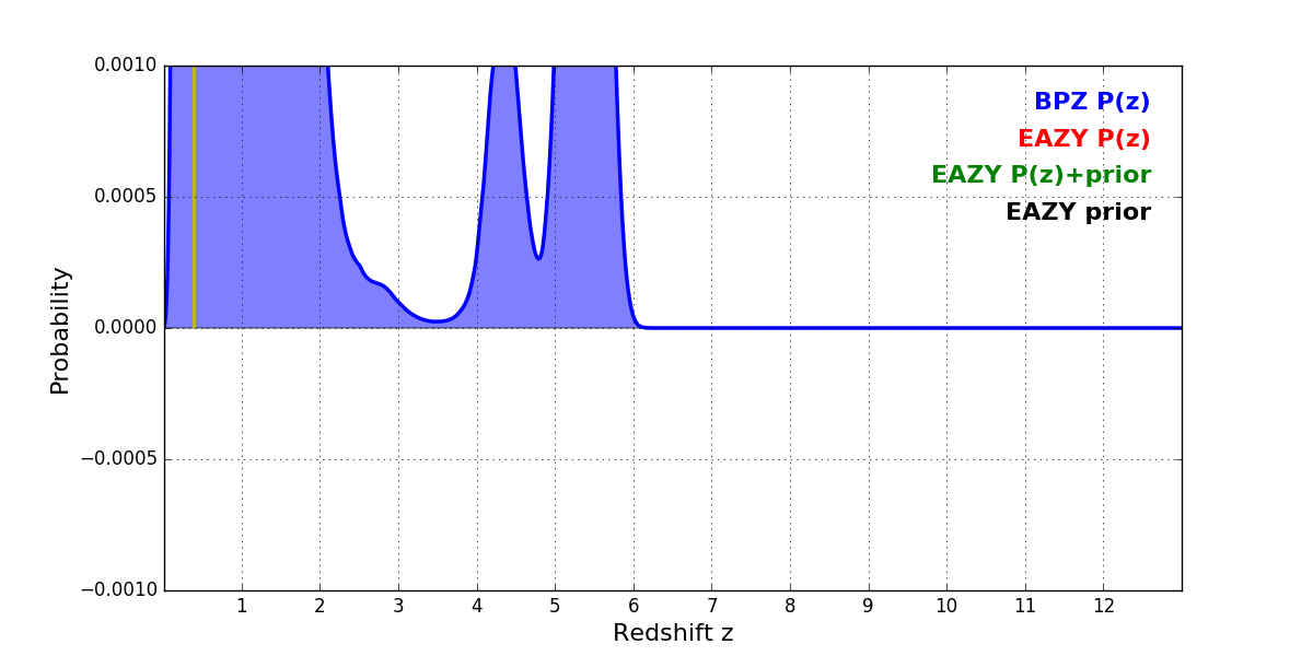 In P(z) plots: Yellow lines mark the cluster redshift z = 0.390,