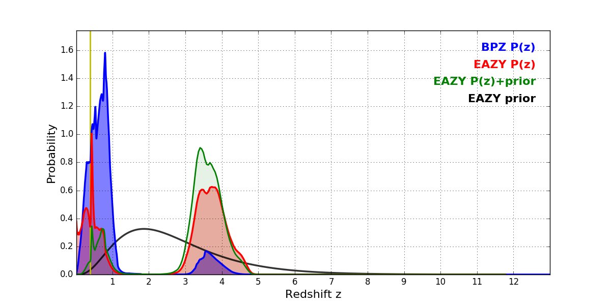 In P(z) plots: Yellow lines mark the cluster redshift z = 0.390,