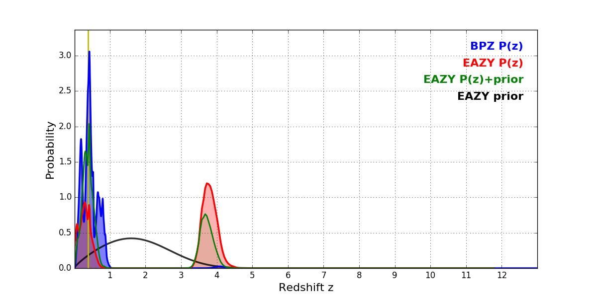 In P(z) plots: Yellow lines mark the cluster redshift z = 0.390,