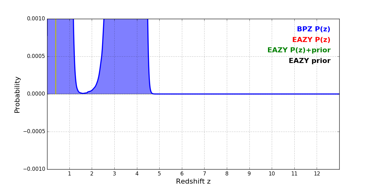 In P(z) plots: Yellow lines mark the cluster redshift z = 0.390,