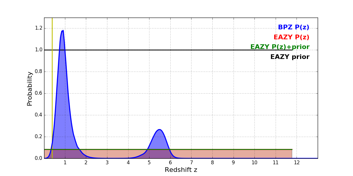 In P(z) plots: Yellow lines mark the cluster redshift z = 0.390,