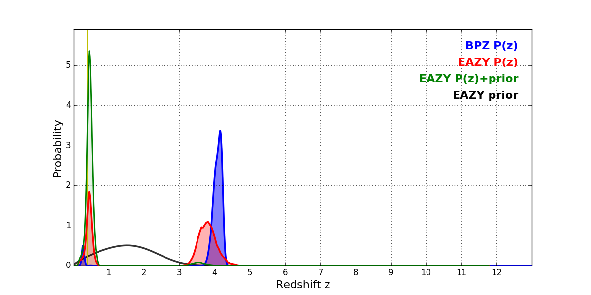 In P(z) plots: Yellow lines mark the cluster redshift z = 0.390,