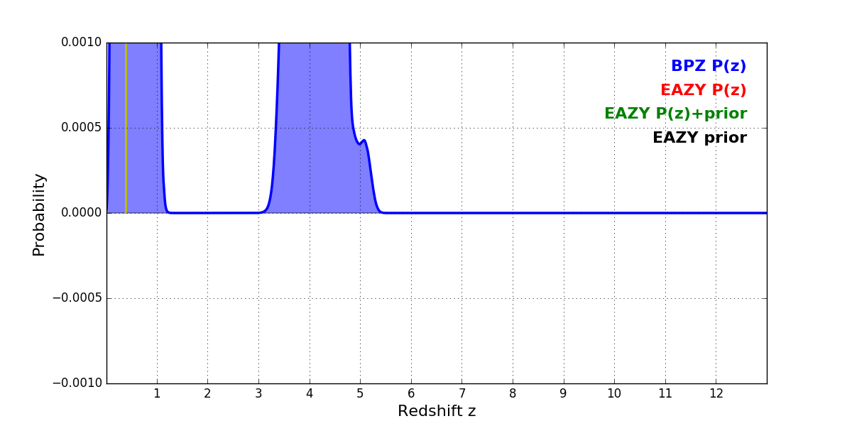 In P(z) plots: Yellow lines mark the cluster redshift z = 0.390,