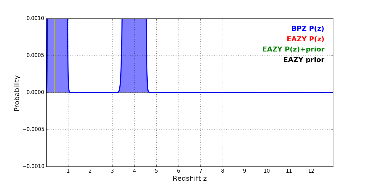 In P(z) plots: Yellow lines mark the cluster redshift z = 0.390,