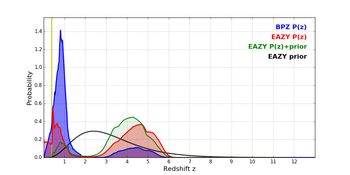 In P(z) plots: Yellow lines mark the cluster redshift z = 0.390,