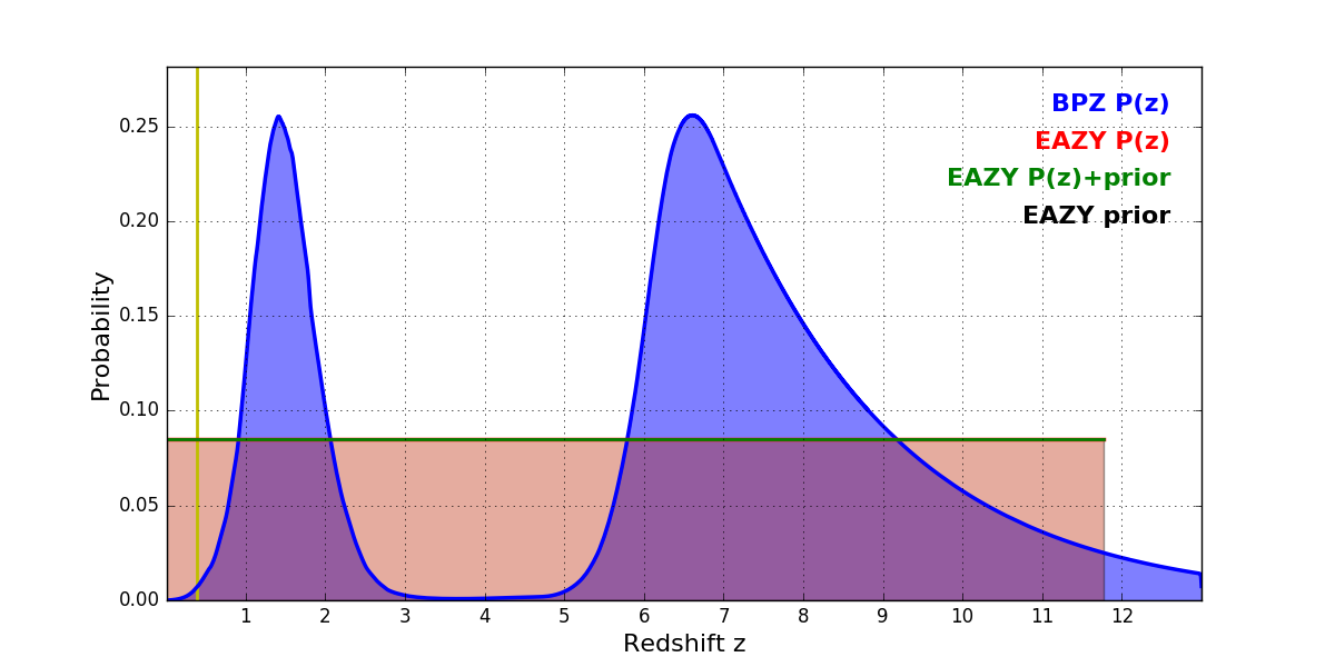 In P(z) plots: Yellow lines mark the cluster redshift z = 0.390,