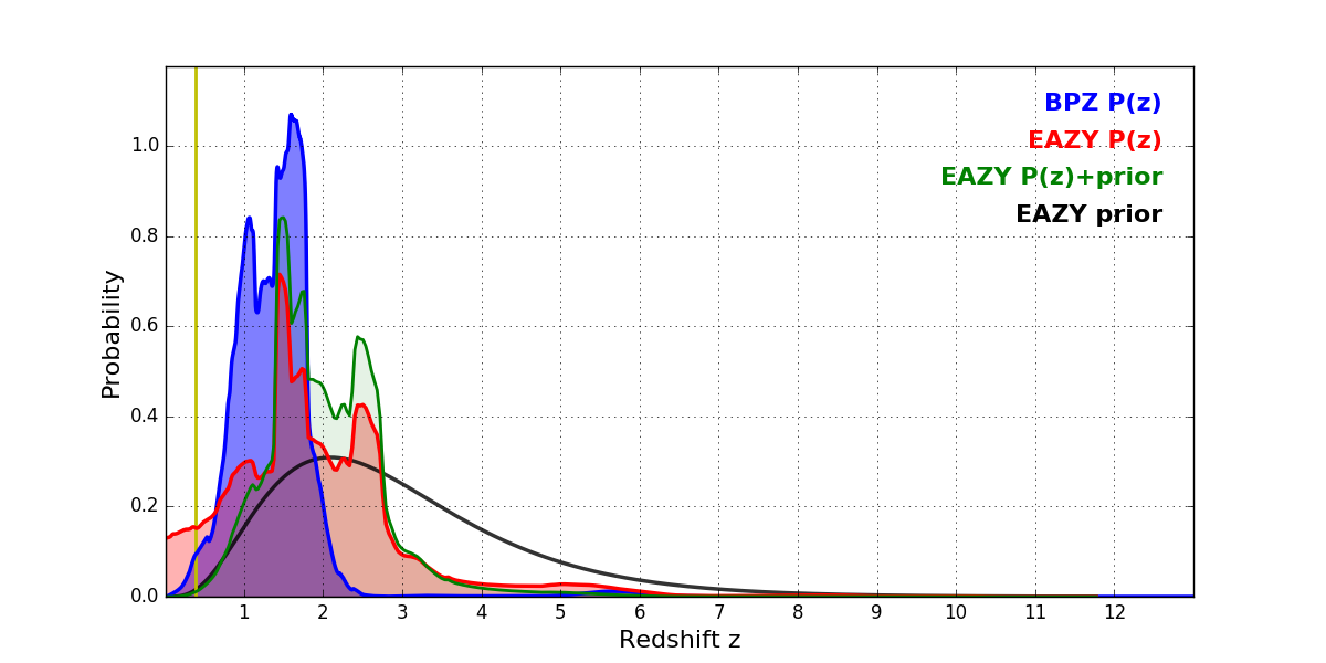 In P(z) plots: Yellow lines mark the cluster redshift z = 0.390,