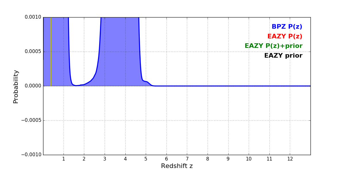 In P(z) plots: Yellow lines mark the cluster redshift z = 0.390,