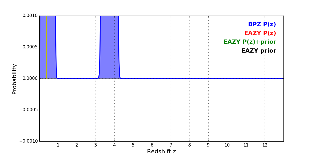 In P(z) plots: Yellow lines mark the cluster redshift z = 0.390,