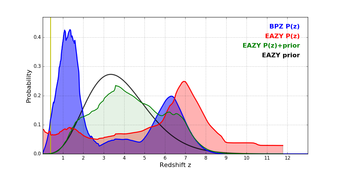 In P(z) plots: Yellow lines mark the cluster redshift z = 0.390,