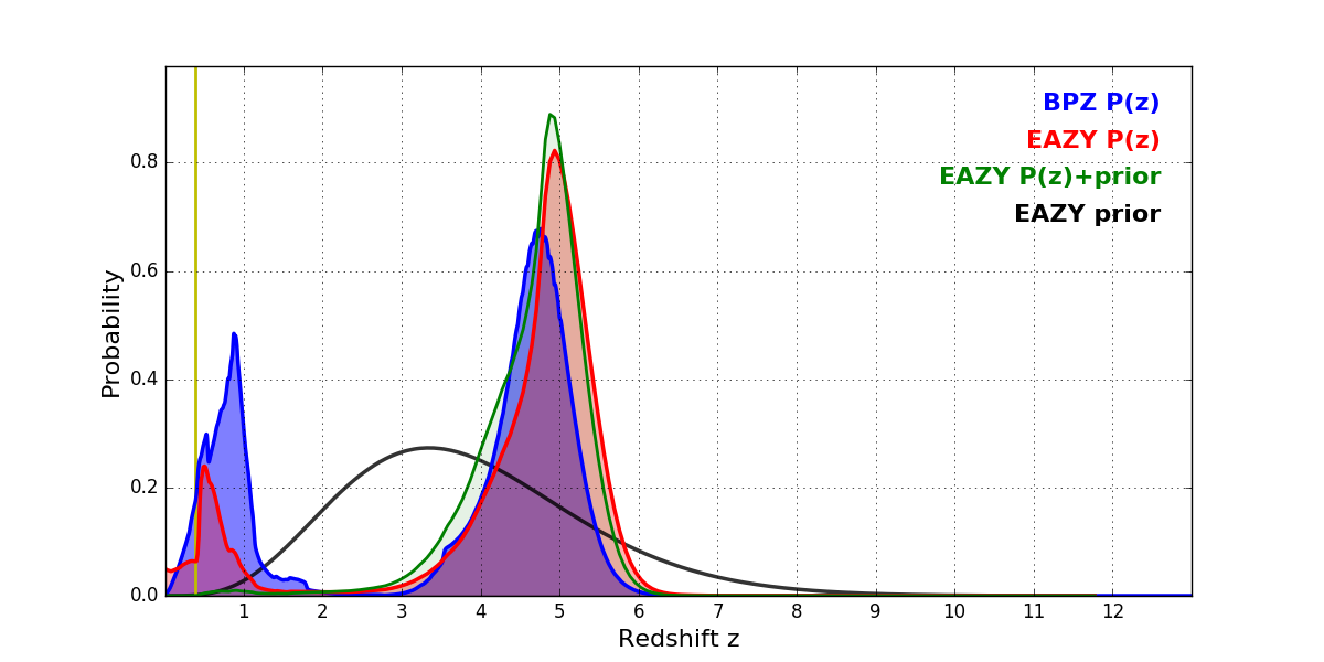 In P(z) plots: Yellow lines mark the cluster redshift z = 0.390,