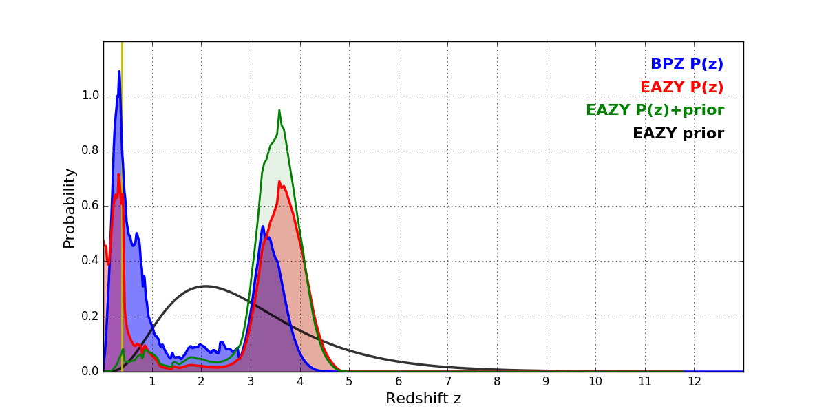 In P(z) plots: Yellow lines mark the cluster redshift z = 0.390,