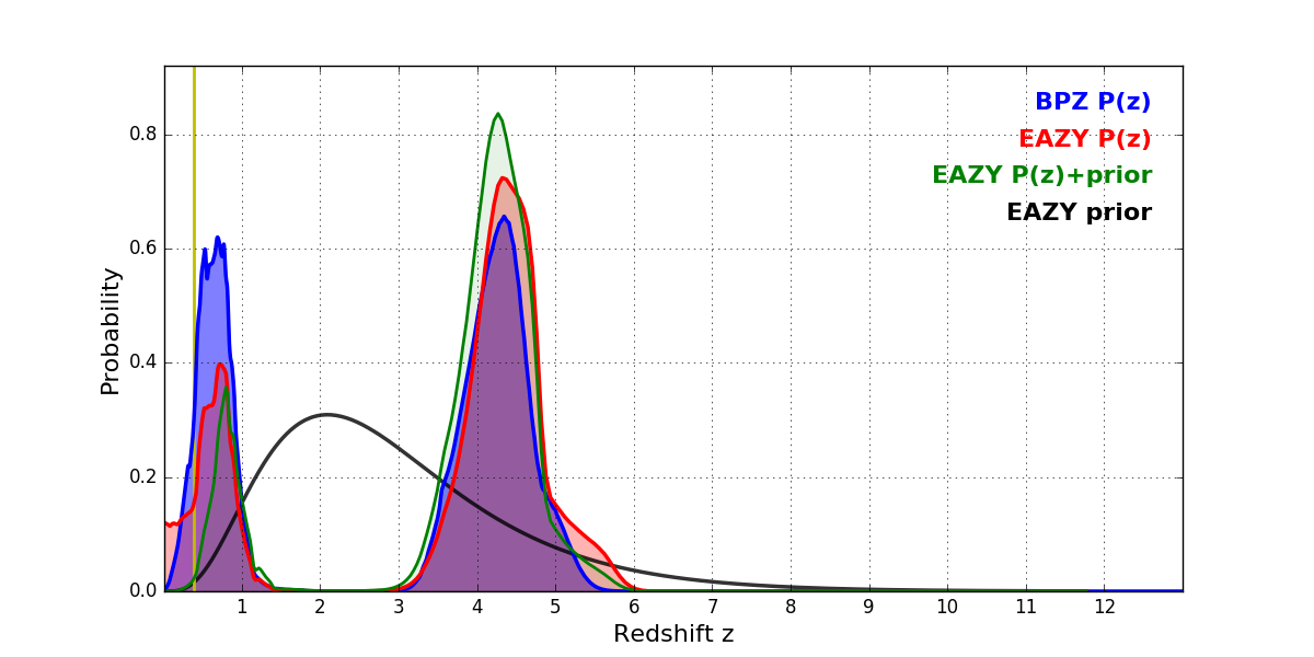 In P(z) plots: Yellow lines mark the cluster redshift z = 0.390,