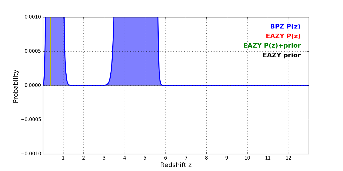 In P(z) plots: Yellow lines mark the cluster redshift z = 0.390,