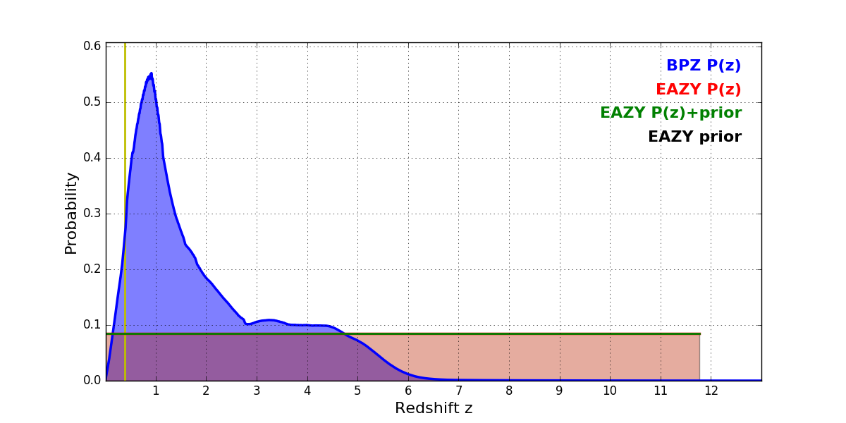 In P(z) plots: Yellow lines mark the cluster redshift z = 0.390,