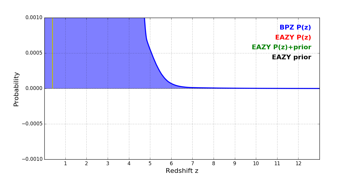 In P(z) plots: Yellow lines mark the cluster redshift z = 0.390,