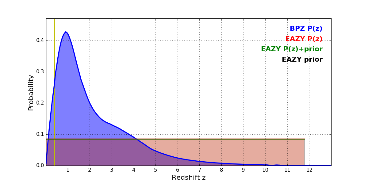 In P(z) plots: Yellow lines mark the cluster redshift z = 0.390,