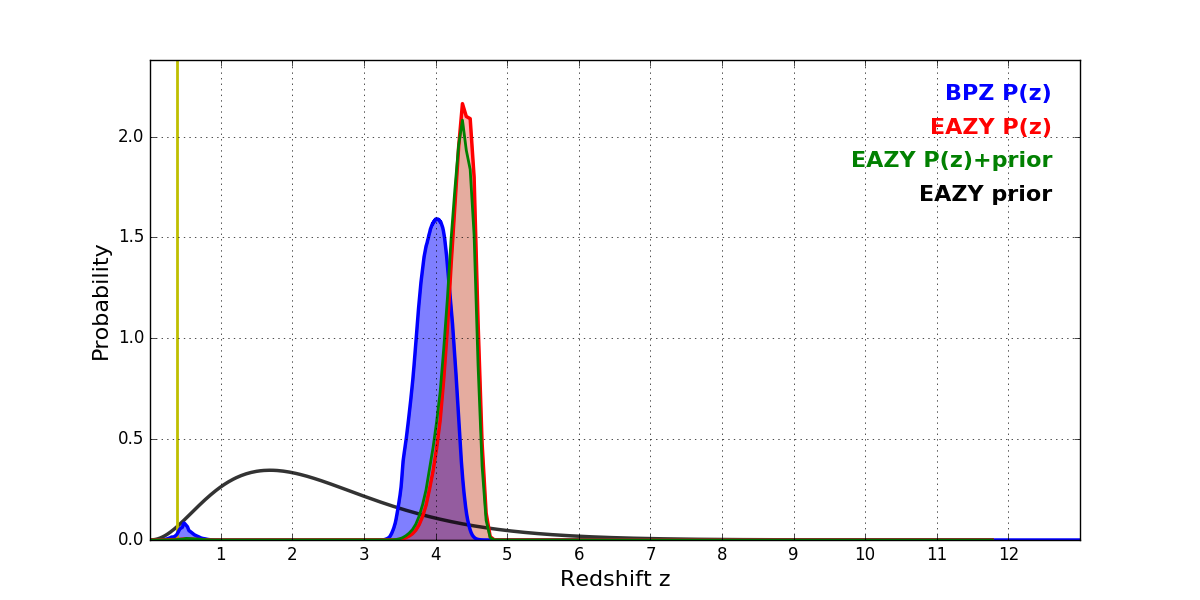 In P(z) plots: Yellow lines mark the cluster redshift z = 0.390,