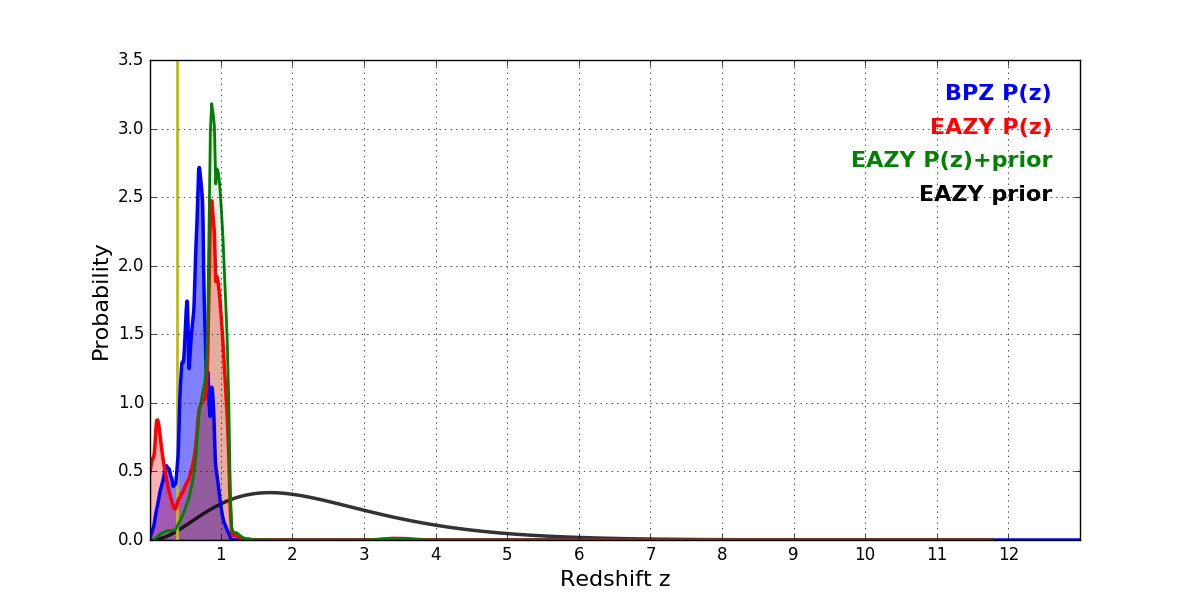 In P(z) plots: Yellow lines mark the cluster redshift z = 0.390,