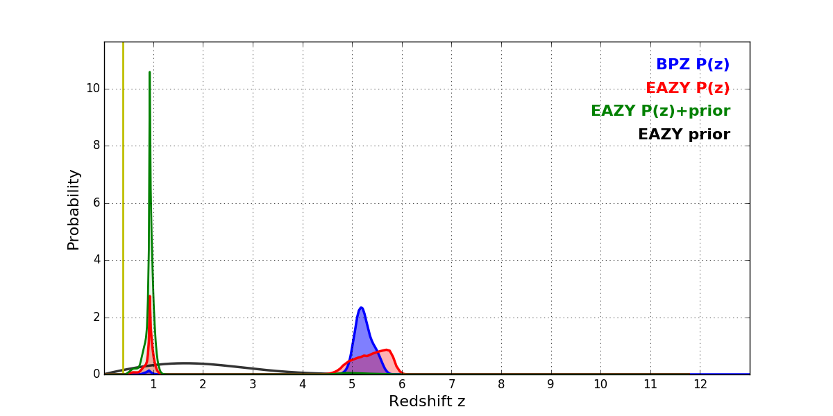In P(z) plots: Yellow lines mark the cluster redshift z = 0.390,