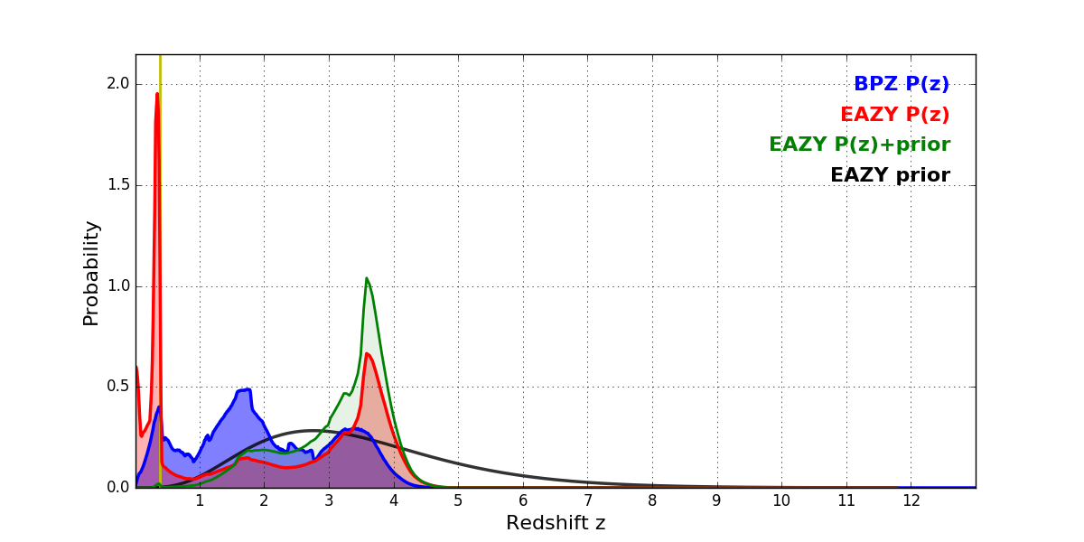 In P(z) plots: Yellow lines mark the cluster redshift z = 0.390,