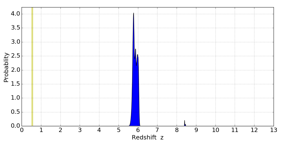 In P(z) plots: Yellow lines mark the cluster redshift z = 0.546,