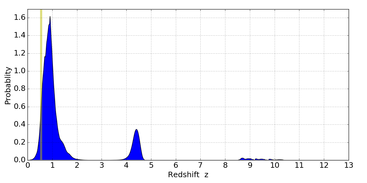 In P(z) plots: Yellow lines mark the cluster redshift z = 0.546,