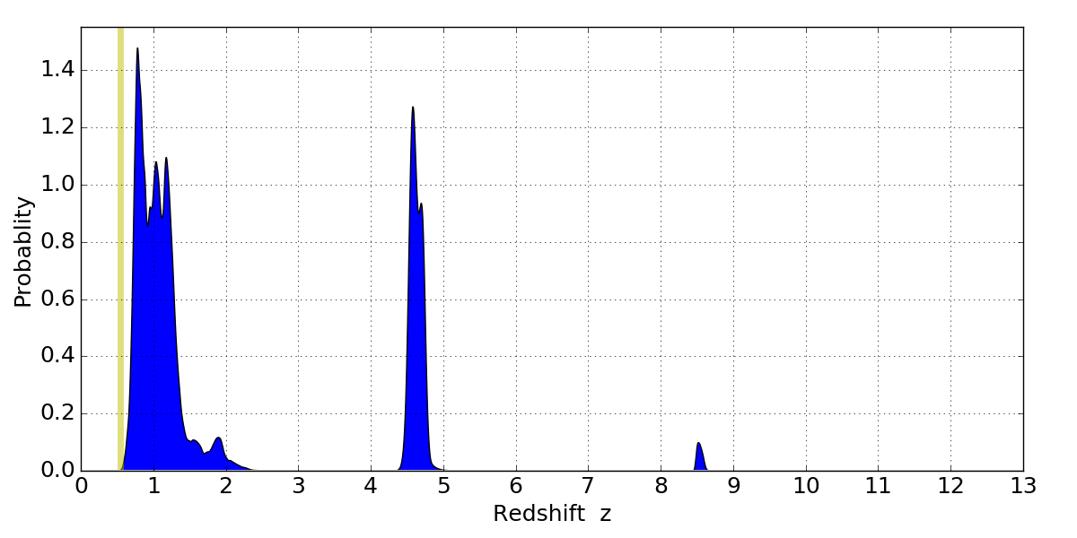 In P(z) plots: Yellow lines mark the cluster redshift z = 0.546,