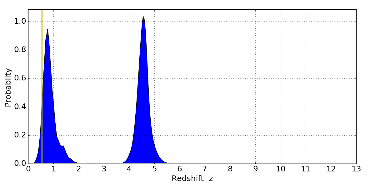 In P(z) plots: Yellow lines mark the cluster redshift z = 0.546,