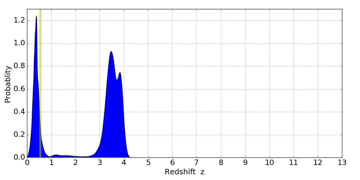 In P(z) plots: Yellow lines mark the cluster redshift z = 0.546,