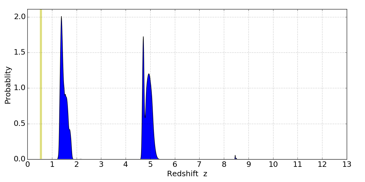 In P(z) plots: Yellow lines mark the cluster redshift z = 0.546,