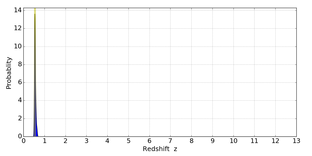In P(z) plots: Yellow lines mark the cluster redshift z = 0.546,