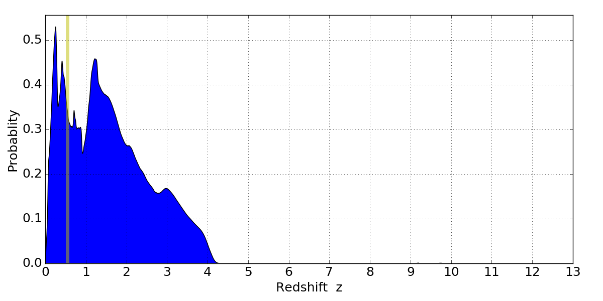 In P(z) plots: Yellow lines mark the cluster redshift z = 0.546,