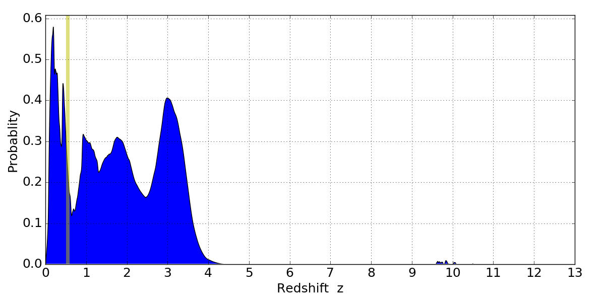 In P(z) plots: Yellow lines mark the cluster redshift z = 0.546,