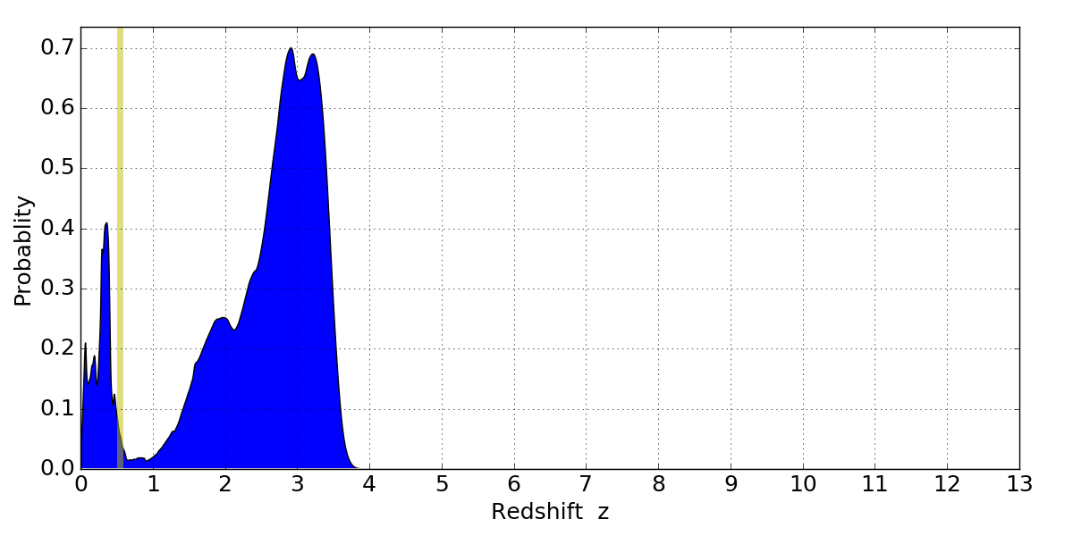 In P(z) plots: Yellow lines mark the cluster redshift z = 0.546,