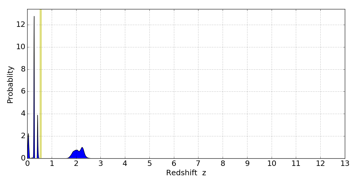 In P(z) plots: Yellow lines mark the cluster redshift z = 0.546,