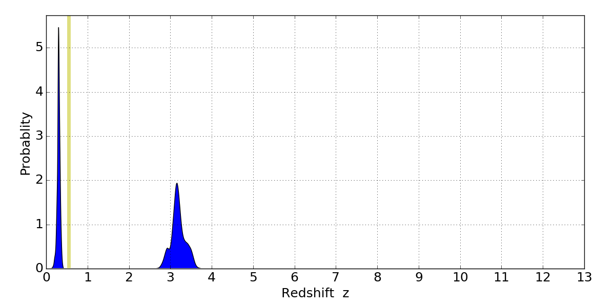 In P(z) plots: Yellow lines mark the cluster redshift z = 0.546,