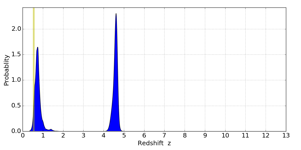 In P(z) plots: Yellow lines mark the cluster redshift z = 0.546,
