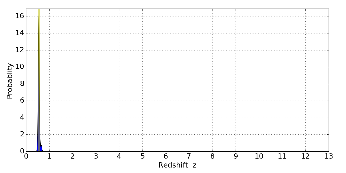 In P(z) plots: Yellow lines mark the cluster redshift z = 0.546,