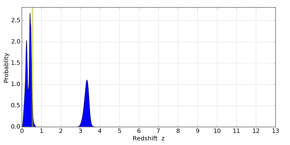 In P(z) plots: Yellow lines mark the cluster redshift z = 0.546,