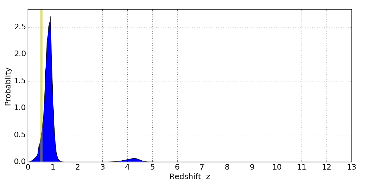 In P(z) plots: Yellow lines mark the cluster redshift z = 0.546,