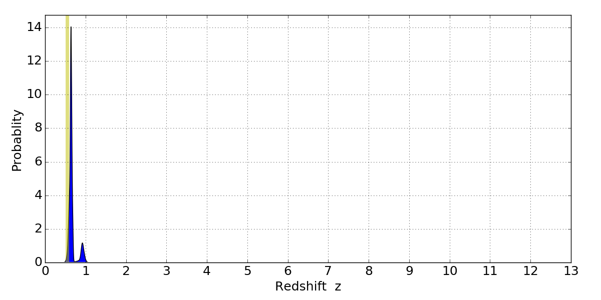 In P(z) plots: Yellow lines mark the cluster redshift z = 0.546,